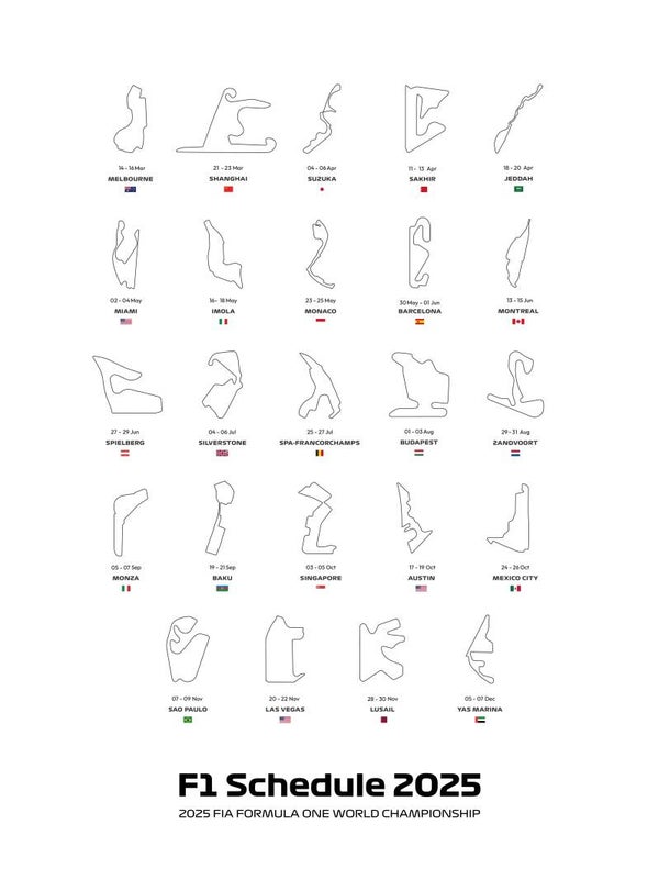 **Onthul de Racekalender**: Maak je klaar om je kalender te markeren met de spannende actie van het FIA F1 Wereldkampioenschap 2025. Onze poster toont de baanindelingen van elke opwindende locatie, versierd met de respectieve nationale vlaggen en de data van deze elektrische evenementen.